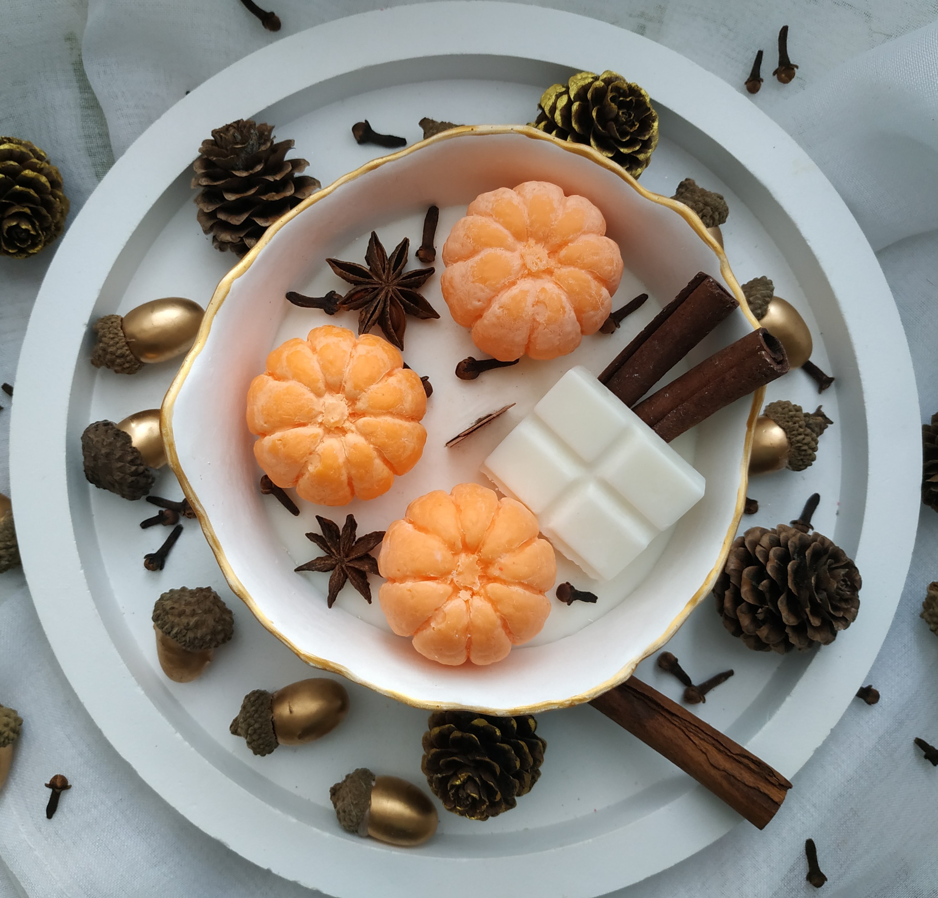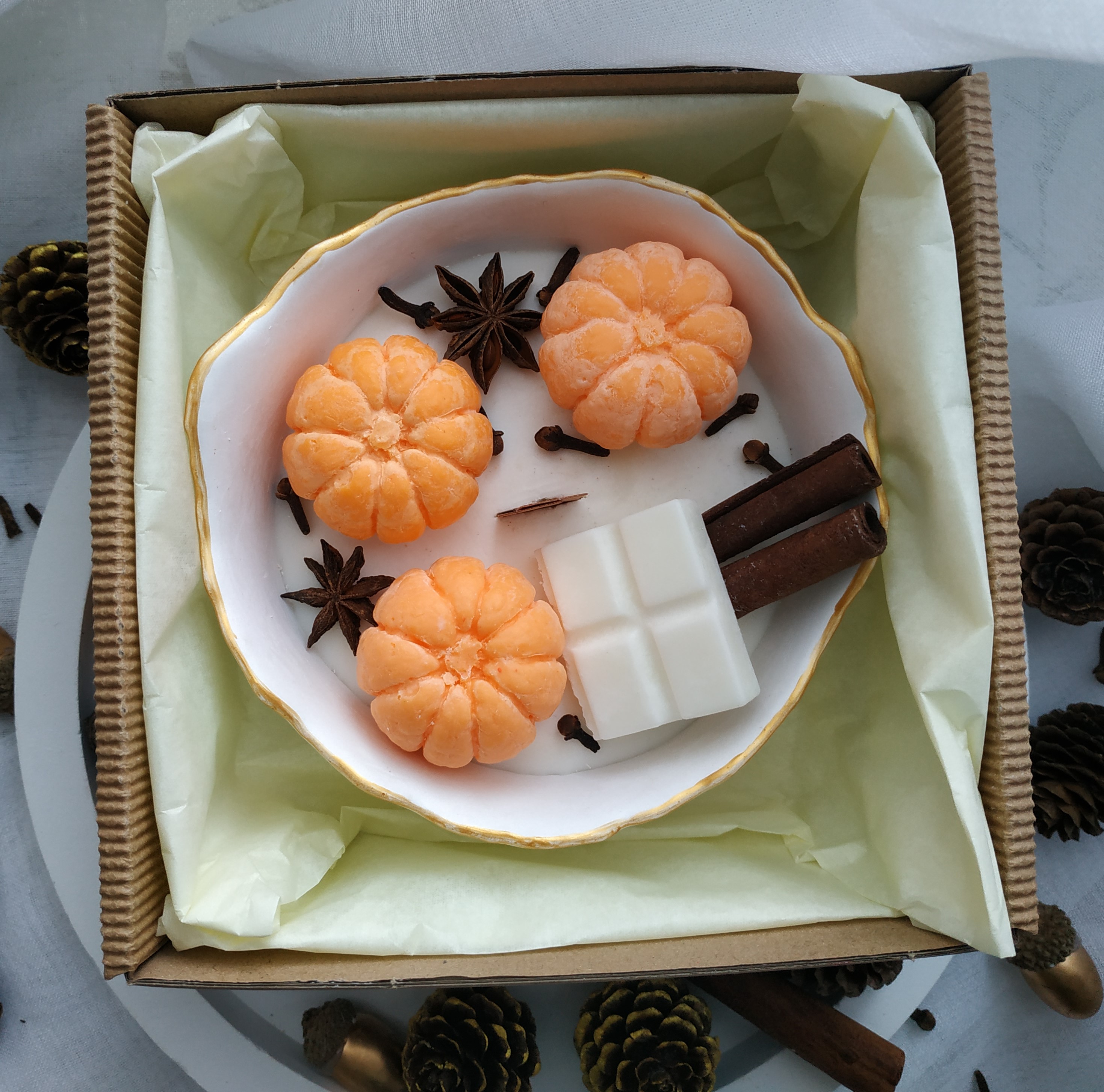 Świeca sojowa z naturalnymi olejkami eterycznymi pomarańczy i cynamonu w pojemniku z gipsu ceramicznego.