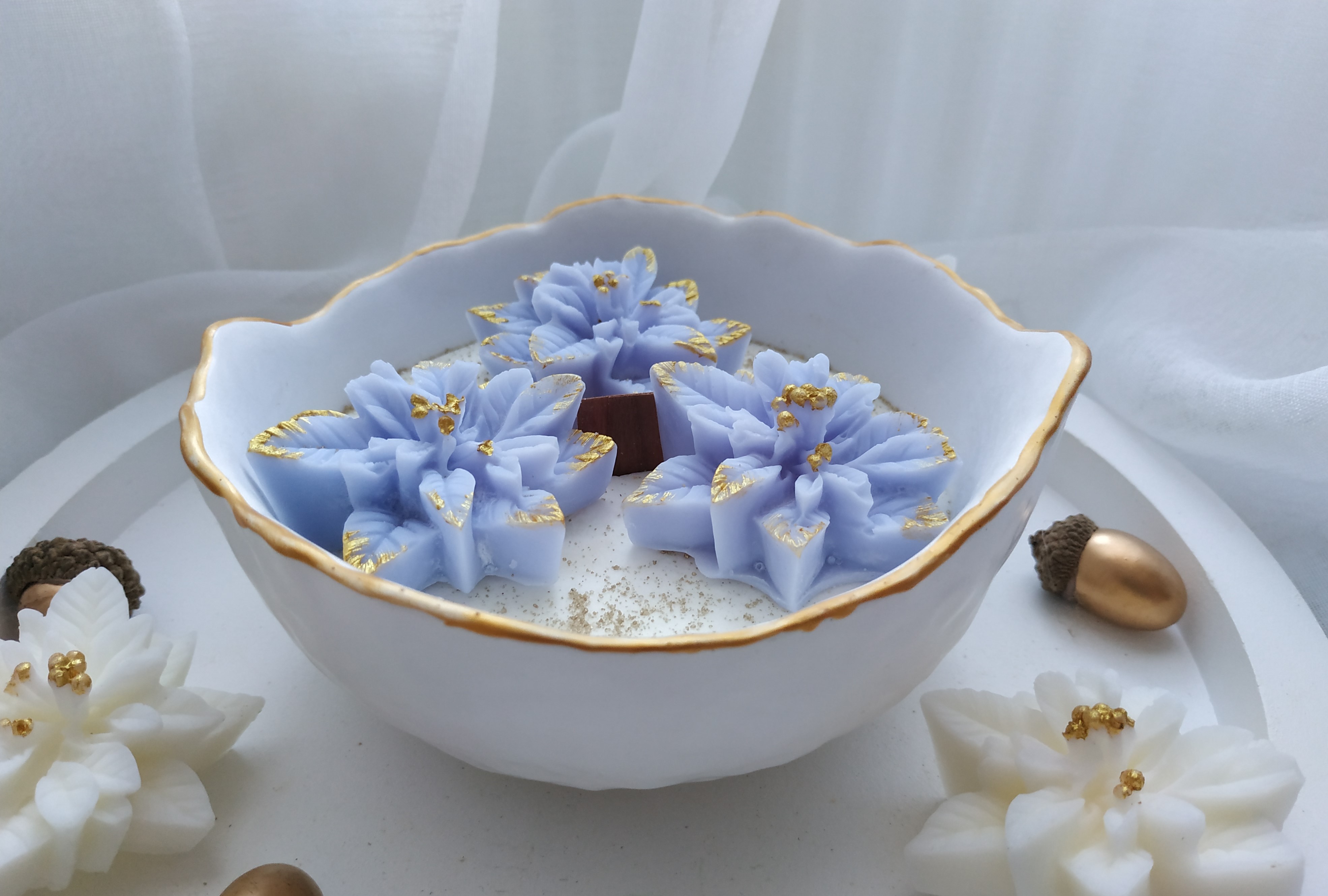 Świeca sojowa o zapachu marcepanu w pojemniku z gipsu ceramicznego.