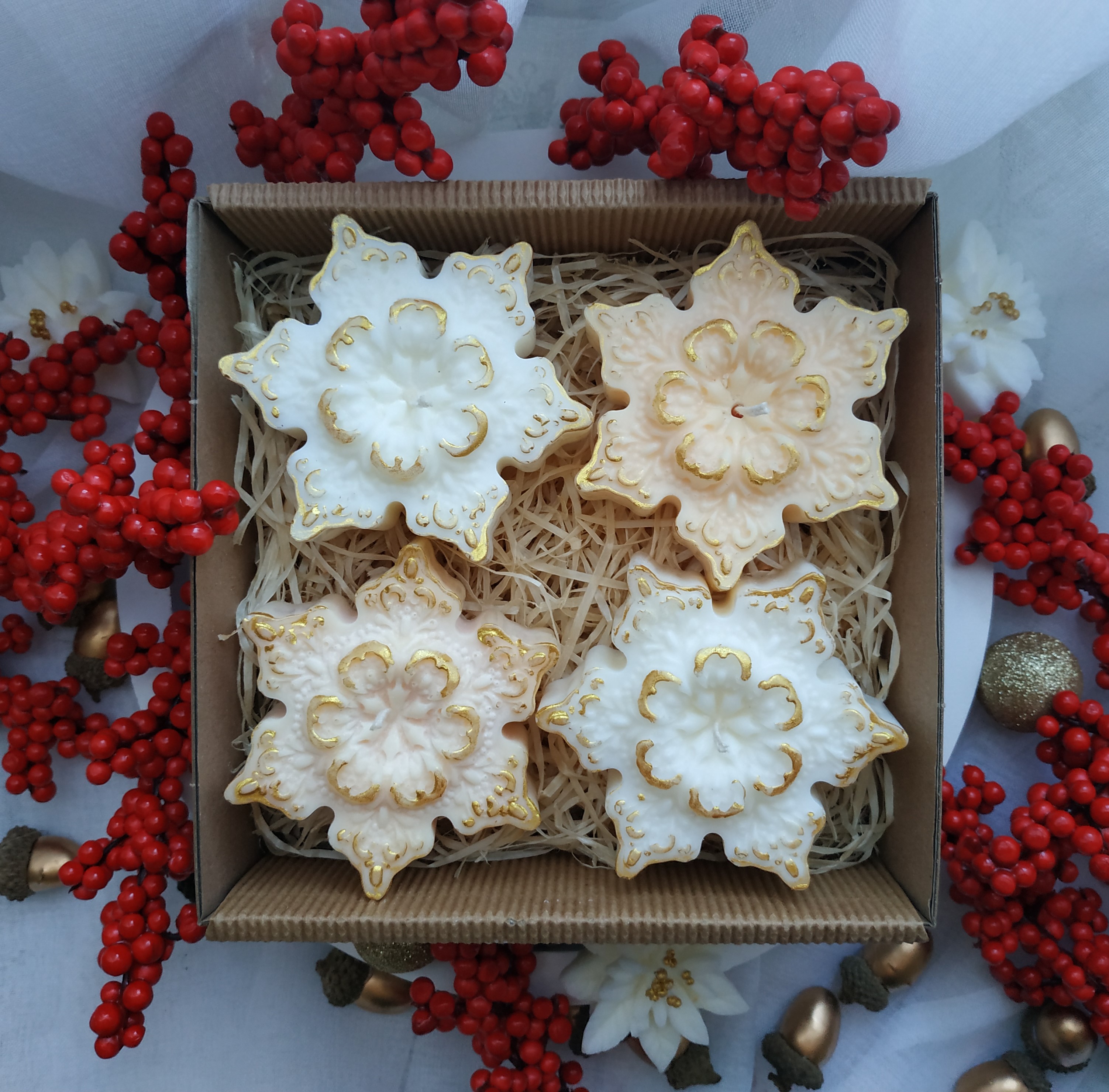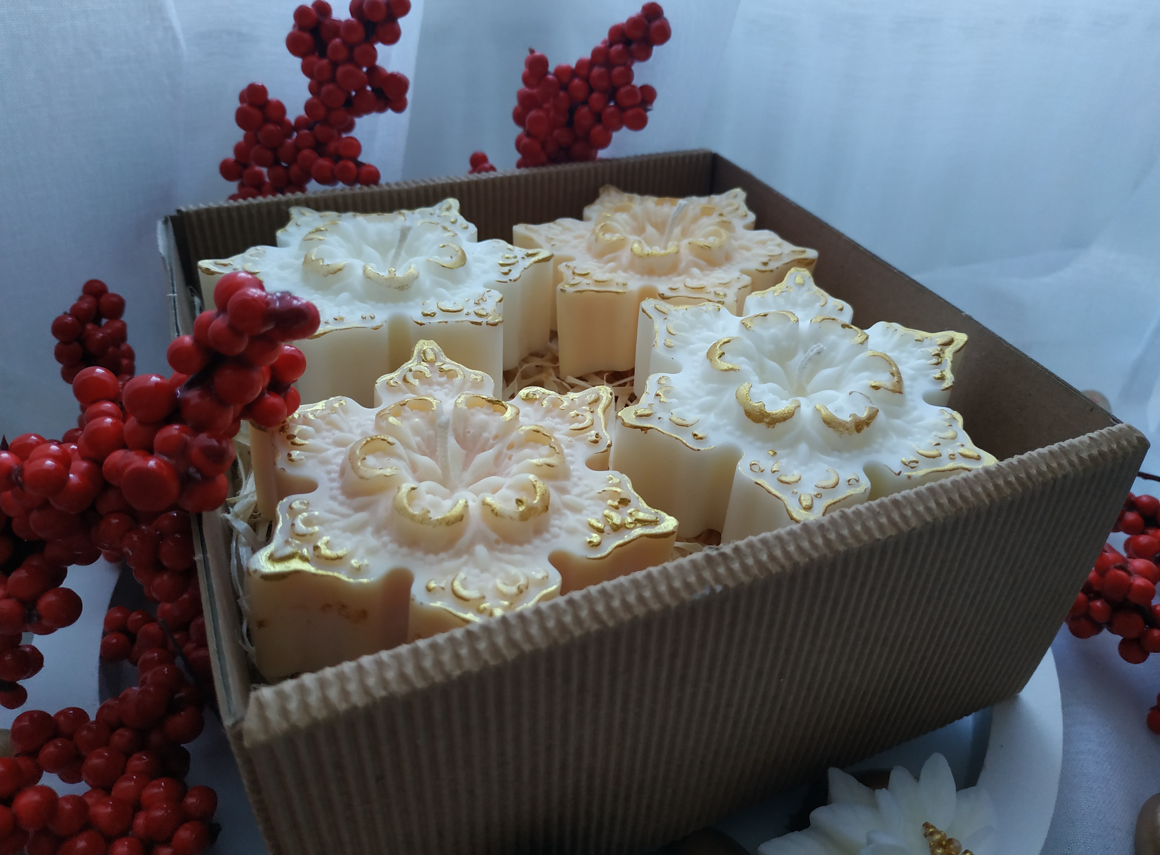 Zestaw czterech świec sojowych gwiazdek o zapachu cynamonu i pomarańczy.