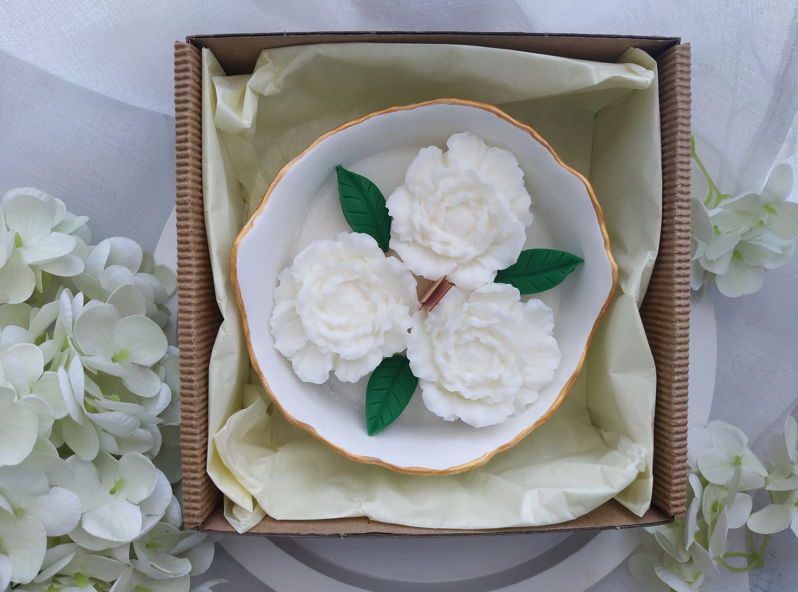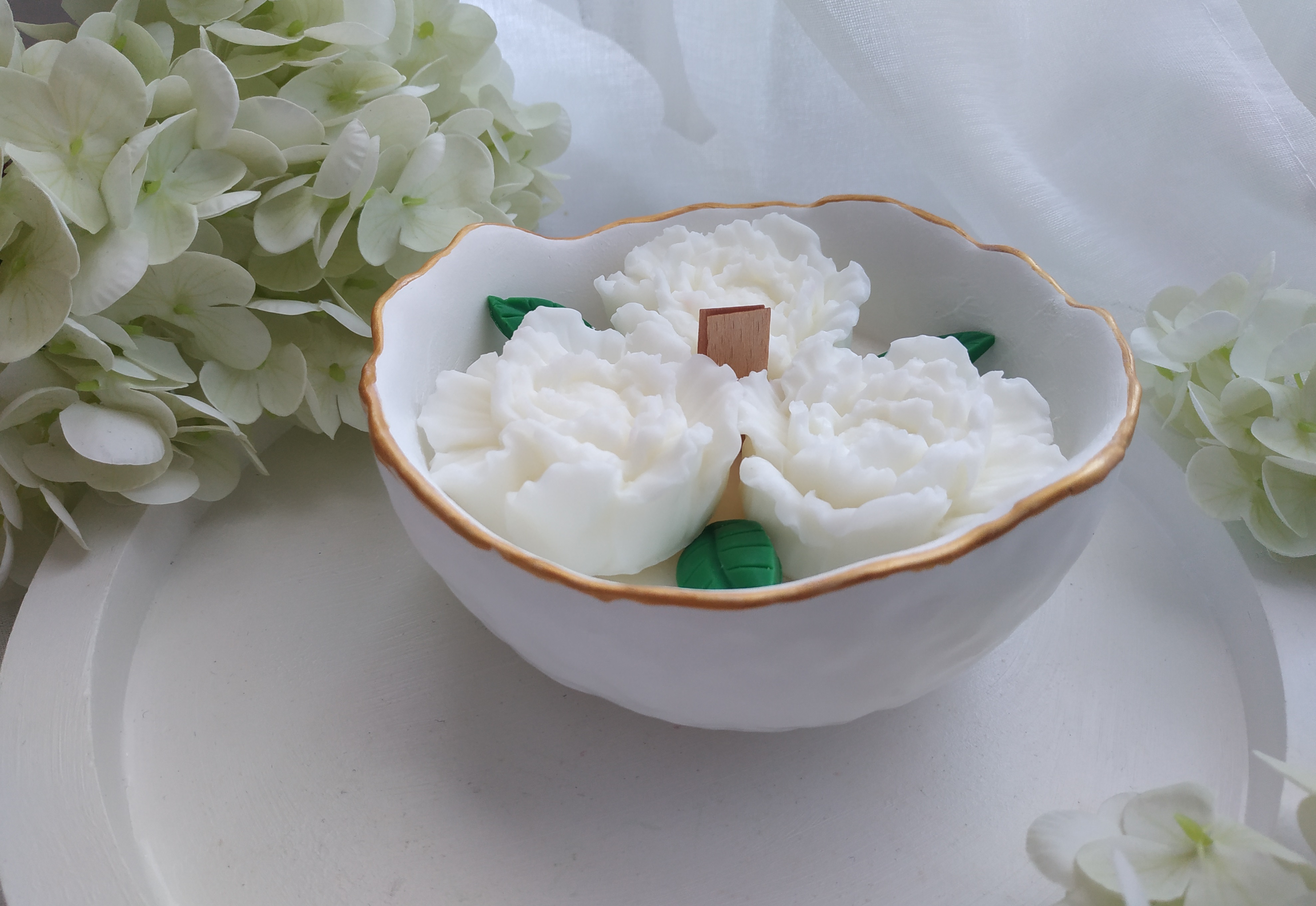Świeca sojowa w pojemniku z gipsu ceramicznego o zapachu konwalii.