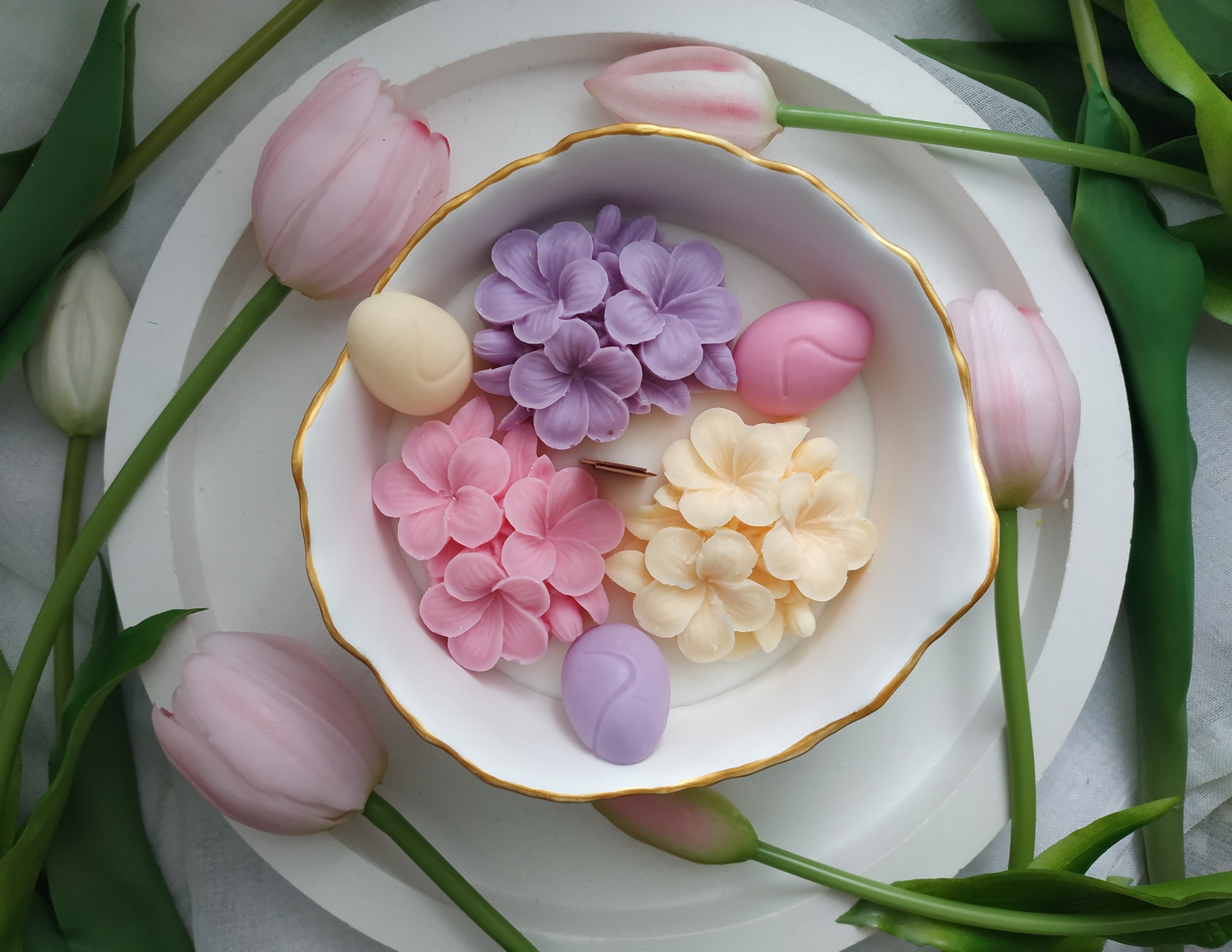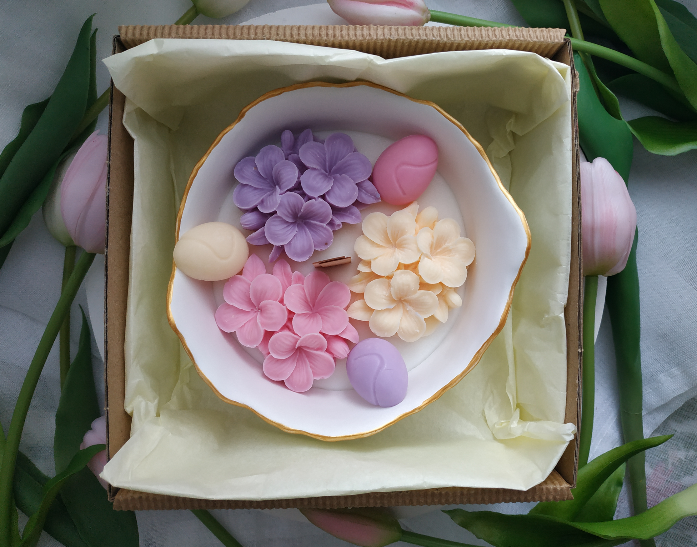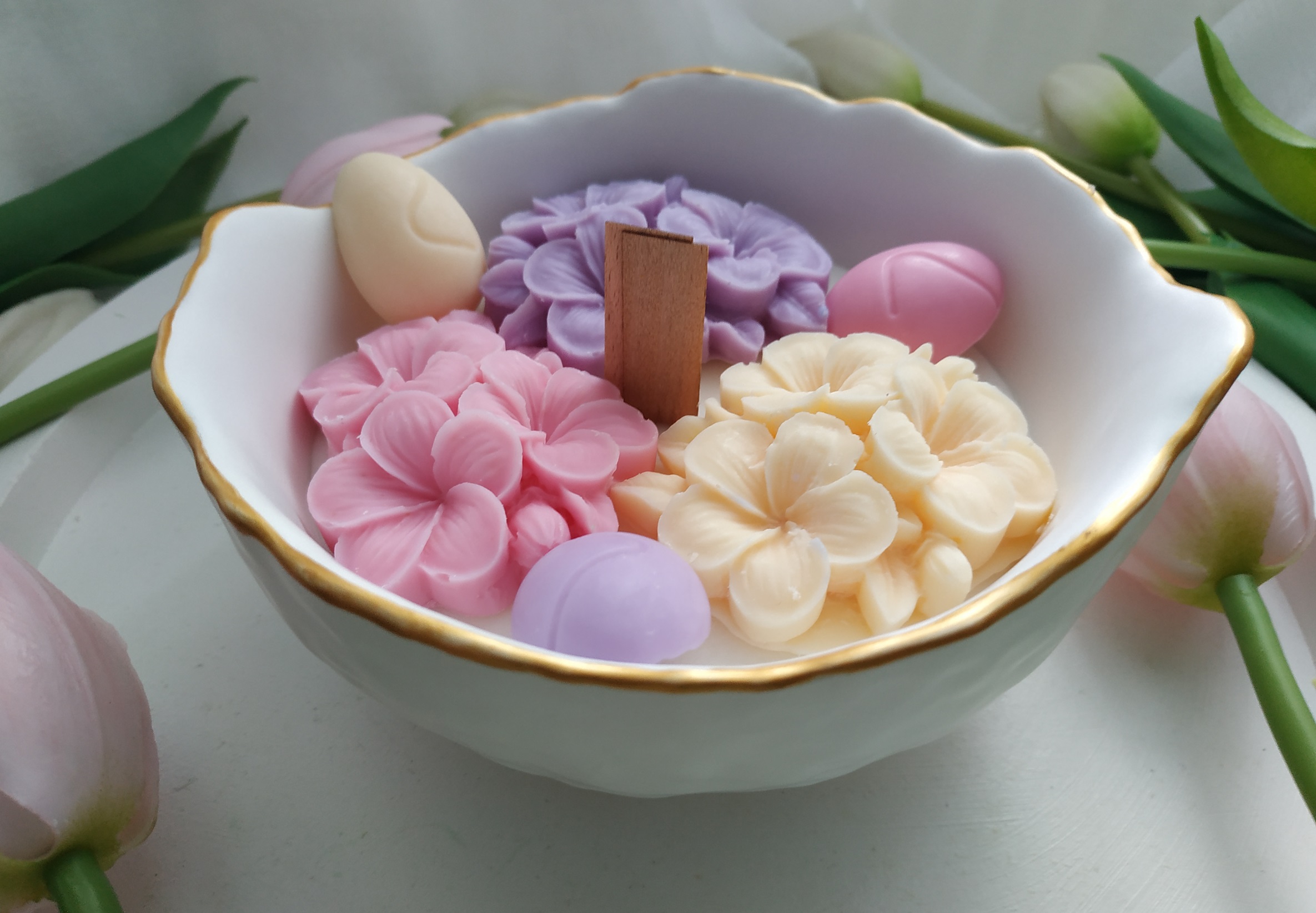Świeca sojowa w pojemniku z gipsu ceramicznego o zapachu róży, bzu i jaśminu.