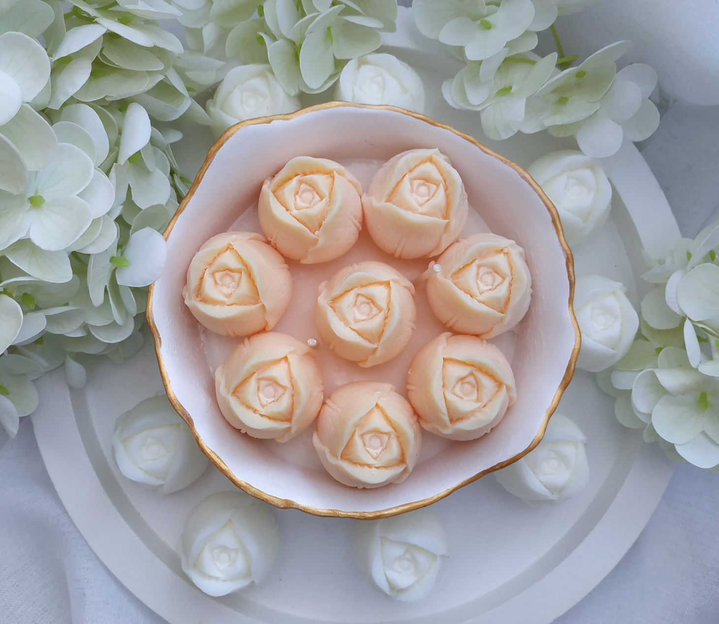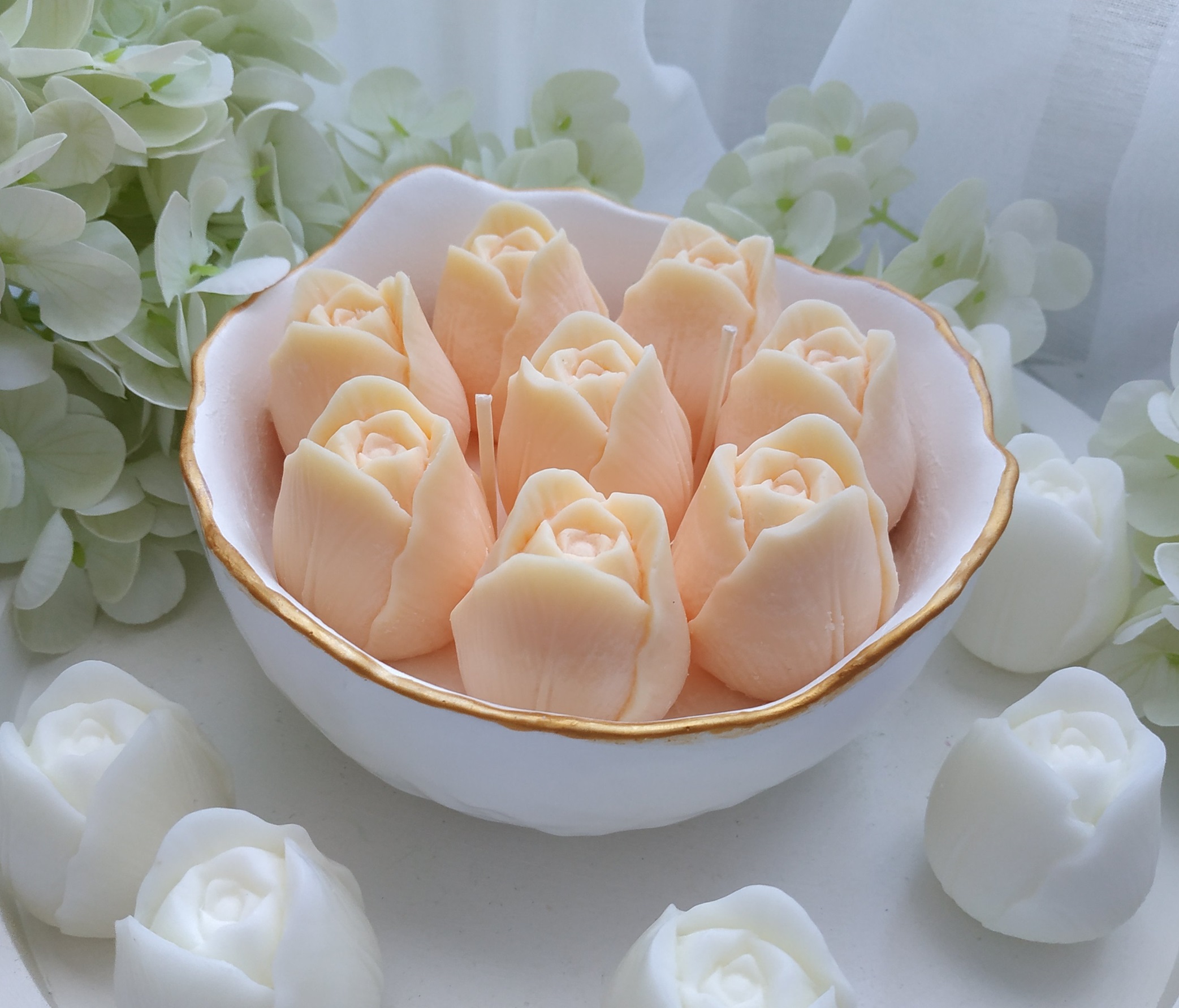 Świeca sojowa w pojemniku z gipsu ceramicznego o zapachu piwonii i róży.