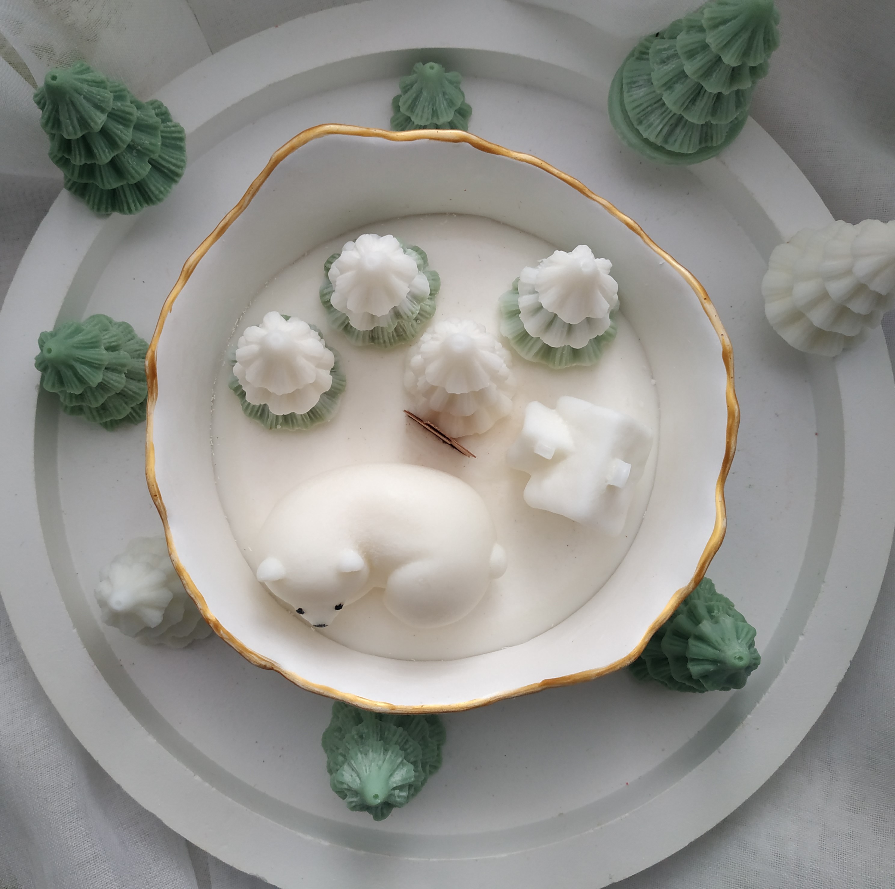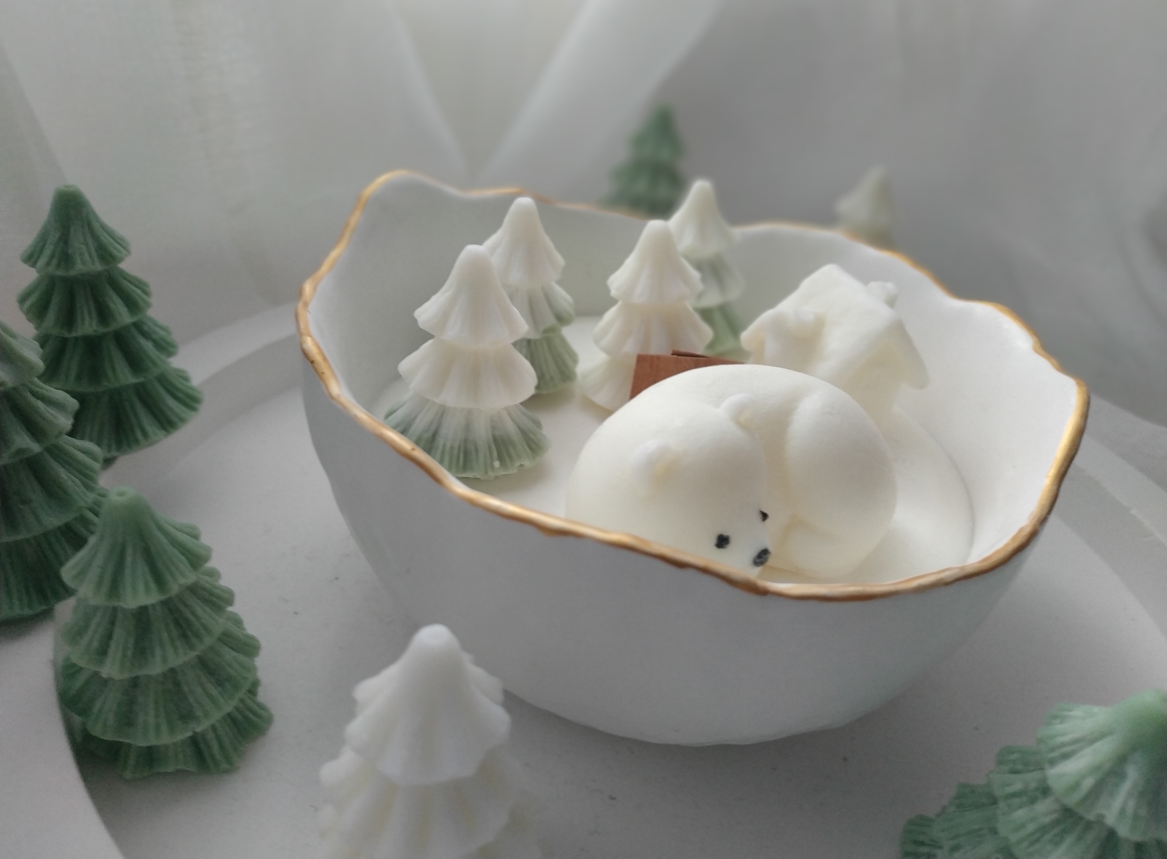 Świeca sojowa o zapachu marcepanu w pojemniku z gipsu ceramicznego.